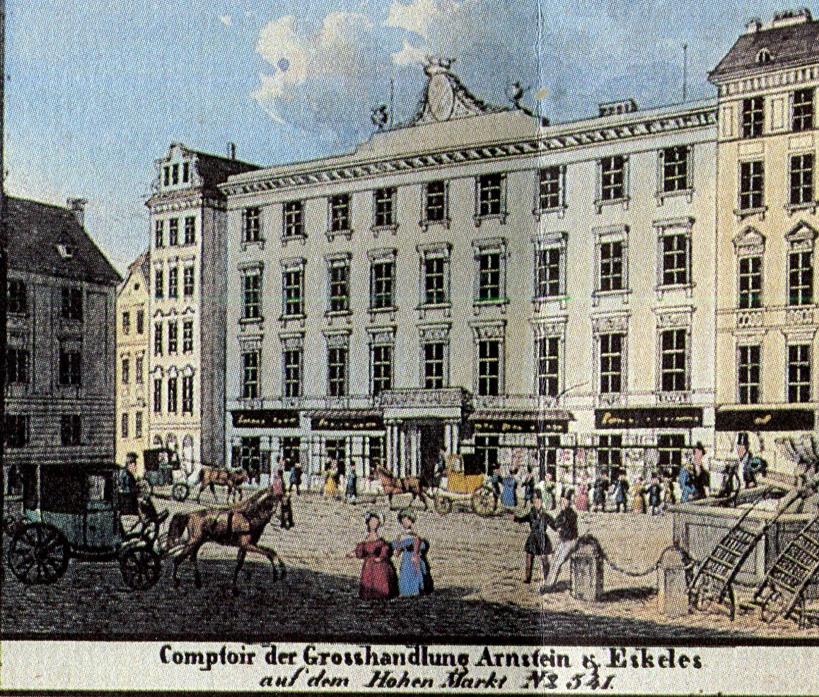 1814/1915, in der Zeit des Wiener Kongresses, waren Nathan und seine Frau, die schöne Fanny, von Arnstein Besitzer des Hauses. Wie der jüdische Großhändler es geschafft hatte, in der Stadt in Grundbesitz zu kommen ist nicht geklärt, im Grundbuch ist - entgegen den damaligen Gepflogenheiten kein Vermerk seiner jüdischen Abstammung. In dem Haus wurden große Empfänge abgehalten, Fanny Arnstein galt als erste jüdische Salonière und Mäzenin. Hier trafen sich Fürsten und Künstler, aber auch Kardinäle und Staatsmänner, die vormittags am Kongress teilnahmen. |