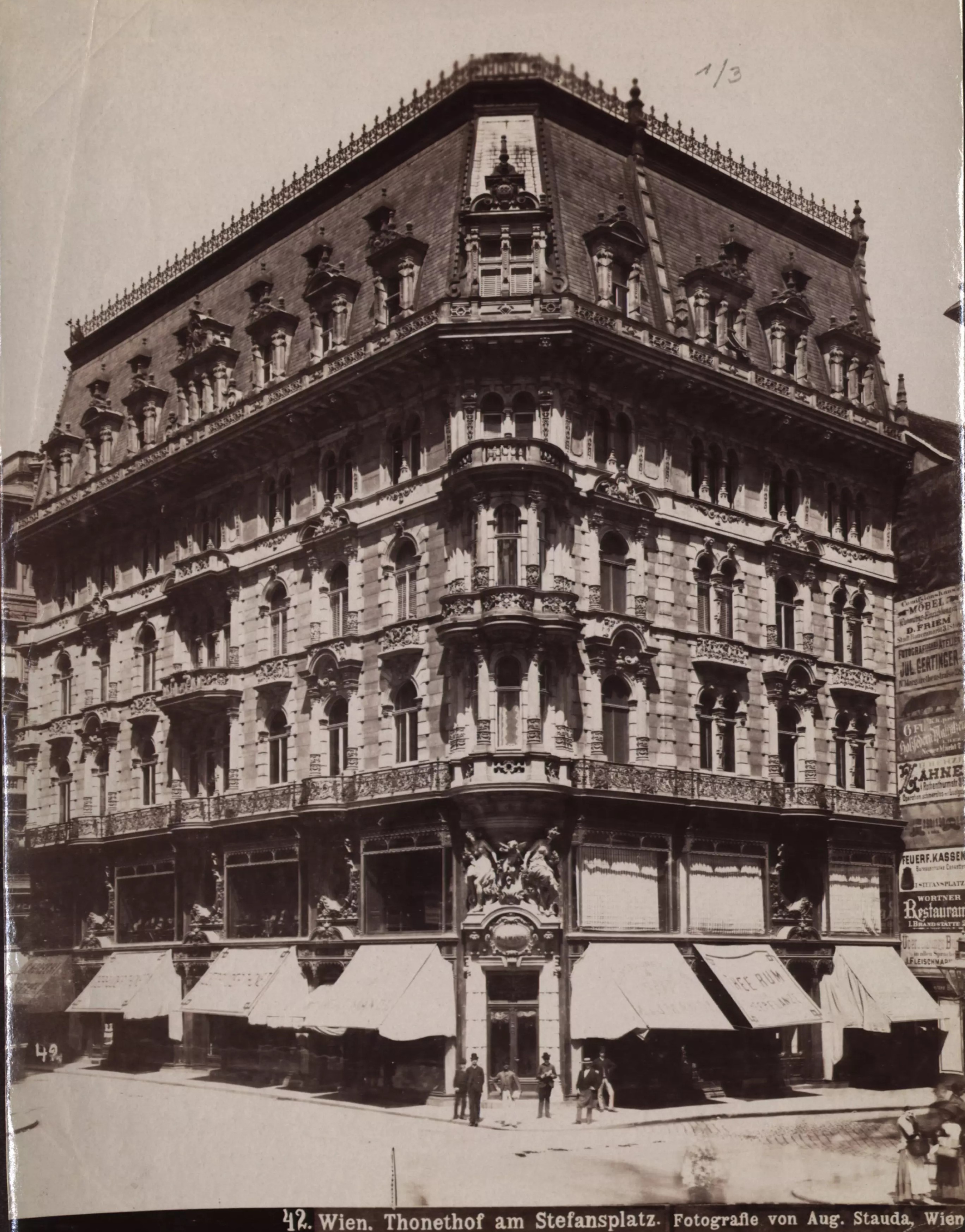 - ↑ August Stauda (Fotograf), 1., Rotenturmstraße 1-3 / Brandstätte 2 - Thonethof, um 1900, Wien Museum Inv.-Nr. 51951/33, CC0 (https://sammlung.wienmuseum.at/objekt/100245/)