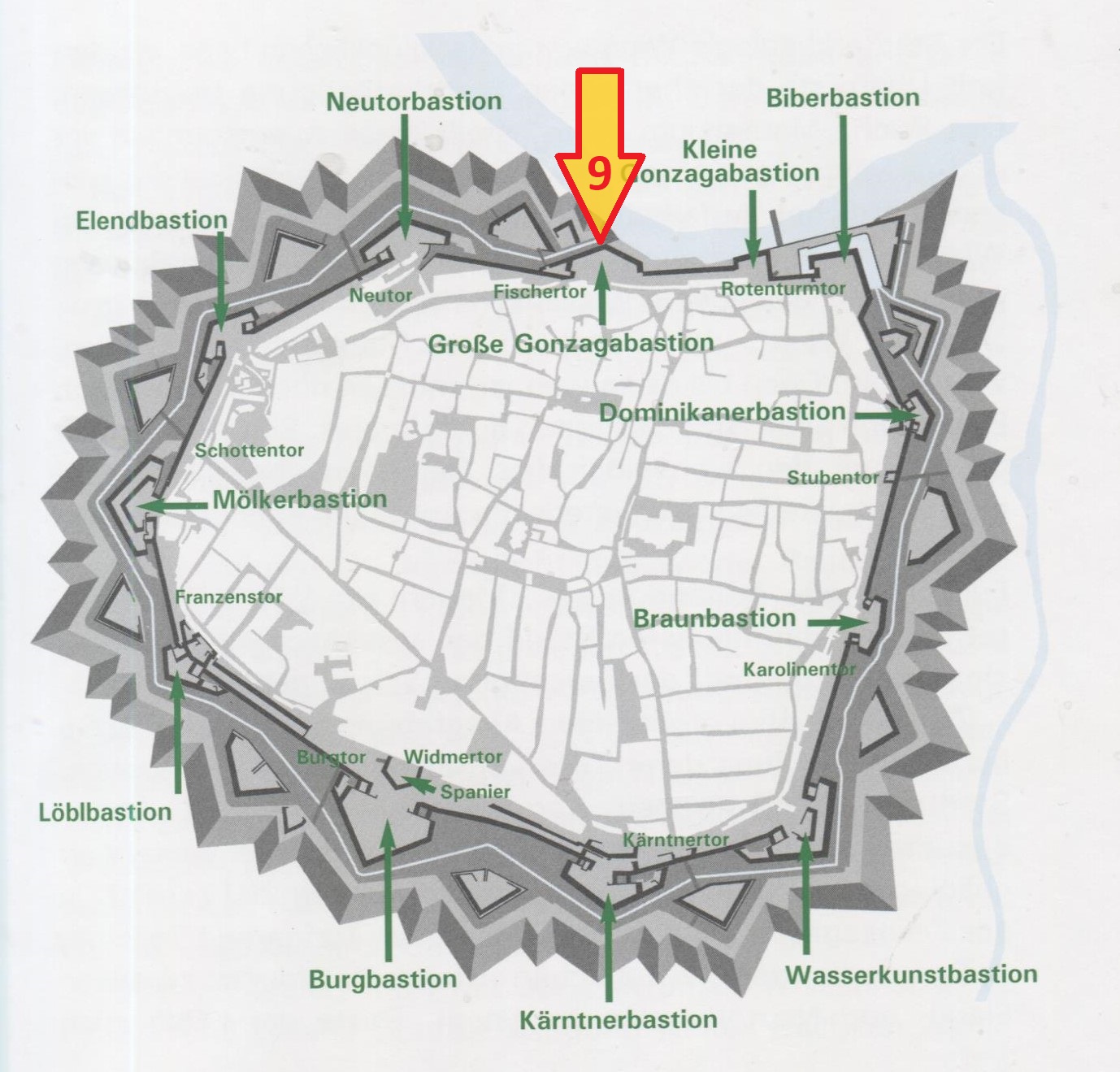 Hat man das Tor passiert, so sieht man in der Stadt das Müllerische Palais mit doppelten Balkonen in seiner ganzen Länge. In der Leopoldstadt drüben steht das Dianabad; die Karls-Kettenbrücke verbindet die Ufer. Diesseits landen die Salz- und Obstschiffe, und dieser Landungsplatz ist der bekannte Schanzl. In der Stadt ist der Fischmarkt, auf welchem freitags auch hölzerne Fisch-Buden aufgerichtet werden, man sieht die St. Ruprechtsstiege hinauf und hat abermals einen Ravelin mit dem Fischertore erreicht. Die Straße in der Stadt ist nun der Salzgries, das hohe altersgraue Gebäude mit Gitterfenstern ist das Polizeihaus, und weiterhin steht dicht am Walle die Grenadierkaserne, die einzige in der Stadt. Auf dem nahen Ravelin springt das Stabsstockhaus (Militär-Arrest) weit vor. Diesem gegenüber steht auf dem Ravelin (Elendbastei) ein kleines Observatorium des Generalstabes.