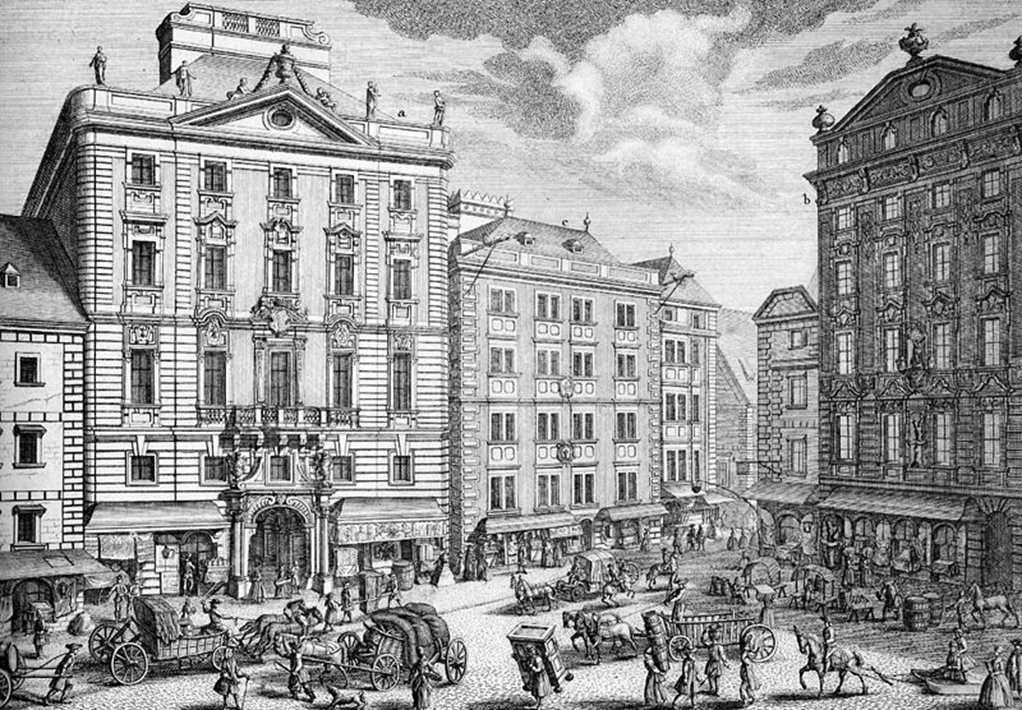 - ↑ Bildarchiv Österr. Nationalbibliothek. Licensed under Public Domain via Wikimedia Commons -http://commons.wikimedia.org/wiki/File:Lazanskyhaus_Stock_im_Eisen_Platz_1874.jpg#/media/File:Lazanskyhaus_Stock_im_Eisen_Platz_1874.jpg