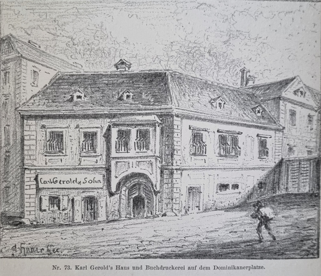 Auch ein Vater, der Buchhändler und Buchdrucker Josef Gerold (*1747, † 24. August 1800, ebenhier [Dominikanerplatz 711]), starb in diesem Haus. Gerold hatte nach langer Tätigkeit für den Buchdrucker Leopold Kaliwoda 1775 selbst eine Buchdruckerei gegründet, er wurde 1780, nach Kauf der vormaligen Newensteinschen Buchhandlung, zum Universitäts-Buchhändler ernannt.